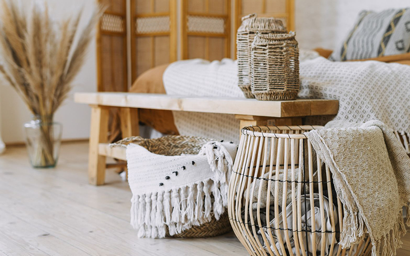 多數人想到秋天的布置,第一個絕不是收納。但編織籃和原木櫃子的質感,卻是房間的美麗配角,同時可以將毯子和枕頭等柔軟物品整齊地收納。