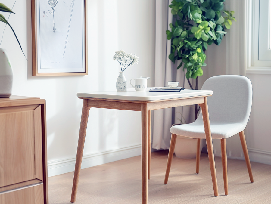 淺色桌面 搭配無彩度椅腳/地板,減少空間壓迫感